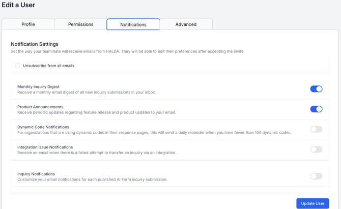 When you’re done toggling on or off the notifications to your preferences, be sure to save by clicking the blue “Update User” button.